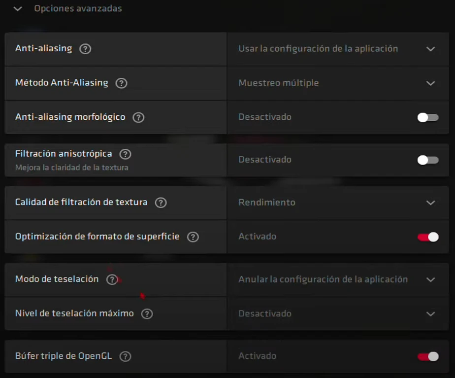 • Anti-aliasing: Usar la configuración de la aplicación