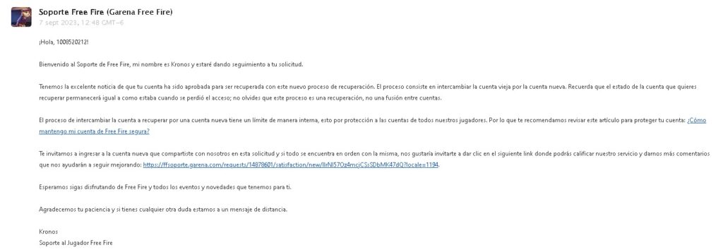 Después de aproximadamente 4 o 5 días hábiles, recibiremos una respuesta de Garena respecto a la aprobación o el rechazo de nuestra solicitud. Si recibes un correo de aprobación, ¡enhorabuena!, has logrado recuperar tu cuenta de Free Fire. Sin embargo, si recibes un correo de rechazo, te recomendamos revisar detenidamente toda la información proporcionada en el formulario y enviarlo nuevamente para una nueva evaluación.
